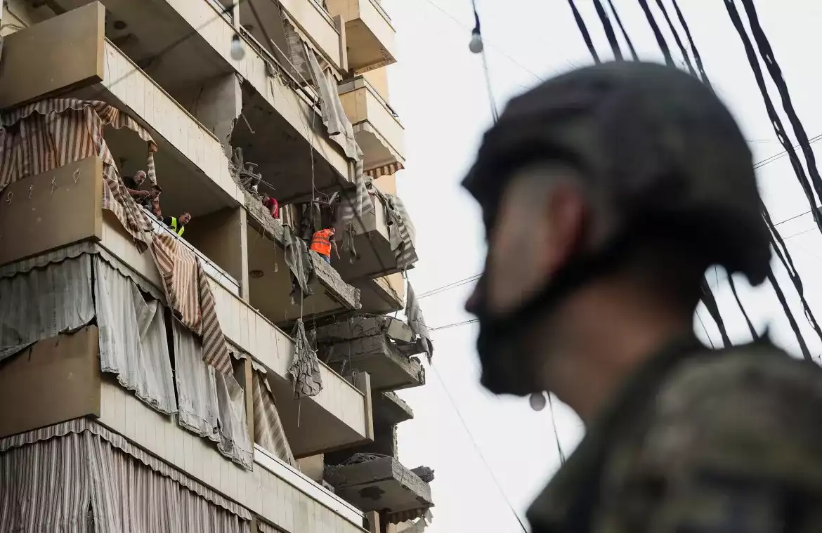 ބެއިރޫތްގެ ދެކުނުގެ އަވަށެއް ކަމަށްވާ ދާހިޔާހްގައި ހުންނަ އެޕާޓްމަންޓަކަށް ހަމަލާ ދިނުމާ ގުޅިގެން ގެއްލުން ލިބުނު ވެހިކަލްތައް ކައިރީގައި ސަލާމަތީ ބާރުތައް ހަރަކާތްތެރިވަނީ - ފޮޓޯ: އޭޕީ