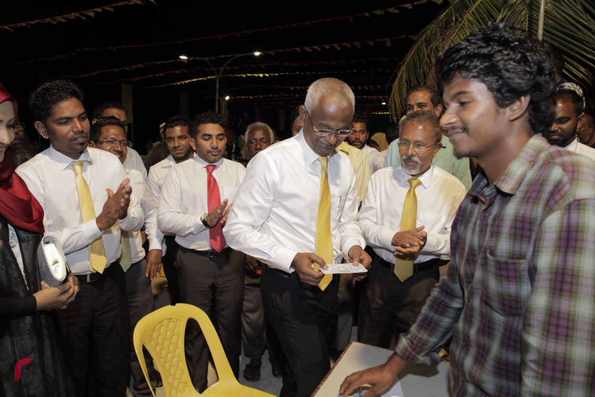 ބްރޮޑްކާސްޓިންގް ކޮމިޝަނުން ރާއްޖެ ޓީވީ ދެ މިލިއަން ރުފިޔާއިން ޖޫރިމަނާކުރުމާ ގުޅިގެން ރާއްޖެ ޓީވީގެ އަބުރުފުޅު ފަންޑްފޮށި ހުޅުވުމަށް ކުރިއަށްގެންދިޔަ ހަރަކާތުގެ ތެރެއިން، މި ހަރަކާތް ޝަރަފްވެރިކޮށްދެއްވައި ފަންޑު ފޮށި ހުޅުވައިދެއްވާފައި ވަނީ ގުޅިފައިވާ އިއްތިހާދުގެ ރިޔާސީ ކެންޑިޑޭޓް އިބްރާހިމް މުހައްމަދު ސޯލިހު -- ފޮޓޯތައް: މުހައްމަދު ޝަރުހާން/ ރާއްޖެ އެމްވީ