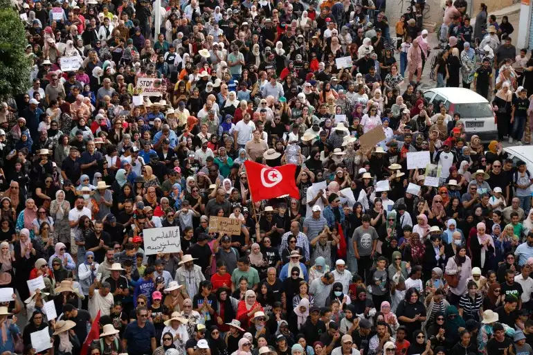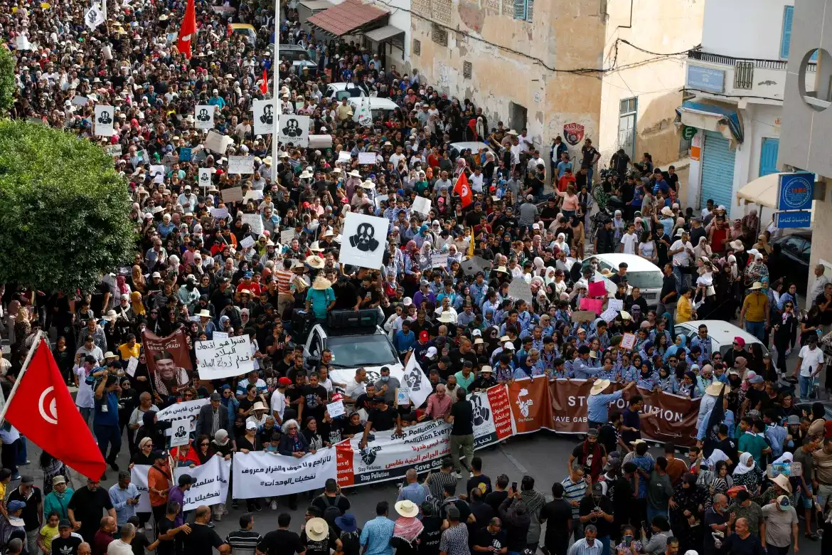 މުޒާހަރާގެ ބައިވެރިން ވަނީ ޓުނީޝިއާގެ ދެކުނުގެ ސިޓީއެއް ކަމަށްވާ ގާބެސް ޕެރަލައިޒްކޮށްފައި - ފޮޓޯ: އޭޕީ